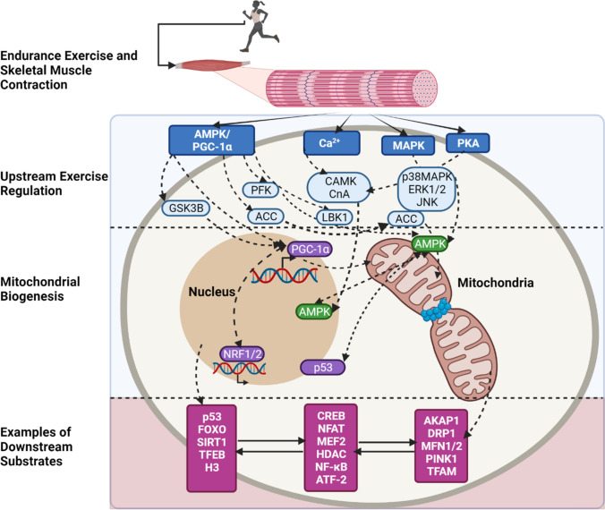 지구력 운동은 골격근 수축을 통해 세포의 에너지 수요를 증가시키며, 이로 인해 미토콘드리아와 핵 간의 신호 전달 경로가 활성화됨. 주요 조절자는 AMPK와 PGC-1α로, 이들은 운동 자극에 반응하여 미토콘드리아 생합성을 조절. 또한, AMPK, MAPK, PKA 및 칼슘 조절 신호 전달 경로와 같은 스트레스 반응 조절자들은 대사, 세포 사멸, 미토콘드리아 생합성 등 하류 생물학적 과정의 조절을 담당.