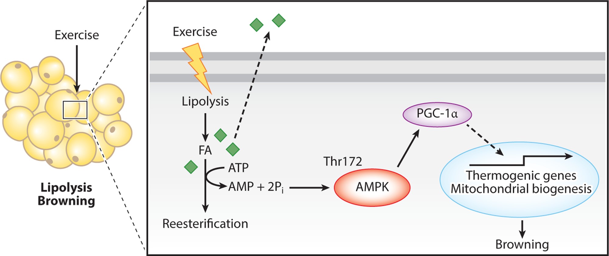 운동은 백색 지방 조직에서 지방 분해를 촉진하여 지방산(FA)의 방출을 증가시키며, 이 FA는 다시 트리아실글리세리드로 재에스테르화됩니다. 이 과정은 ATP를 소모하고, AMPK가 활성화되어 PGC-1α를 촉진함으로써 열생성 유전자 전사와 미토콘드리아 생합성이 증가.
