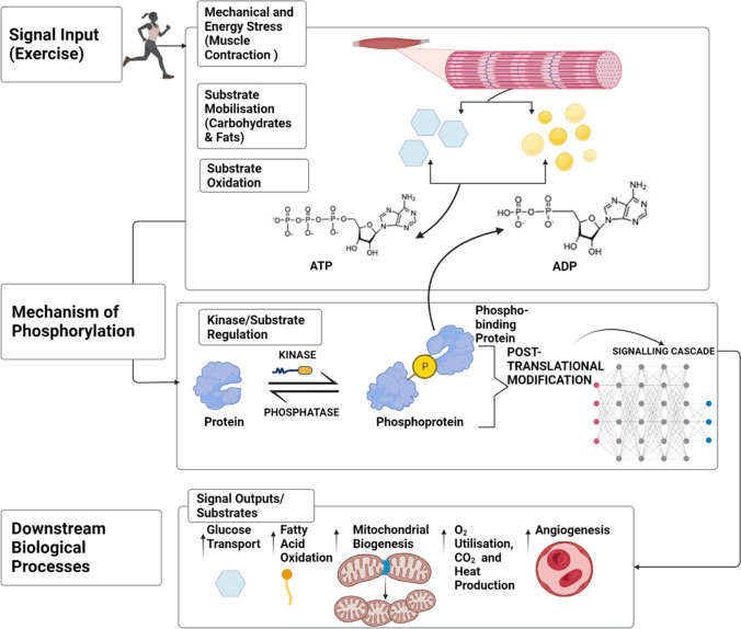 운동 신호 전달 네트워크에서 단백질 키나아제는 기질 단백질의 인산화를 개시하고 하류 생물학적 과정을 조절하는 중요한 역할을 함. 운동과 같은 세포 교란은 에너지 스트레스를 유발하고, 이로 인해 신호 전달 경로가 활성화됨. 단백질 키나아제는 ATP를 가수분해하여 기질 단백질에 인산기를 추가하며, 이 과정은 세포 내 에너지 기질 회전과 하류 신호 전달 이벤트를 유도. 인산화는 단백질 키나아제와 인산화효소의 이중 활성에 의해 조절될 수 있으며, 이는 ‘분자 스위치’ 역할을 하여 기질 단백질의 기능과 하류 생물학적 과정을 조절함.
