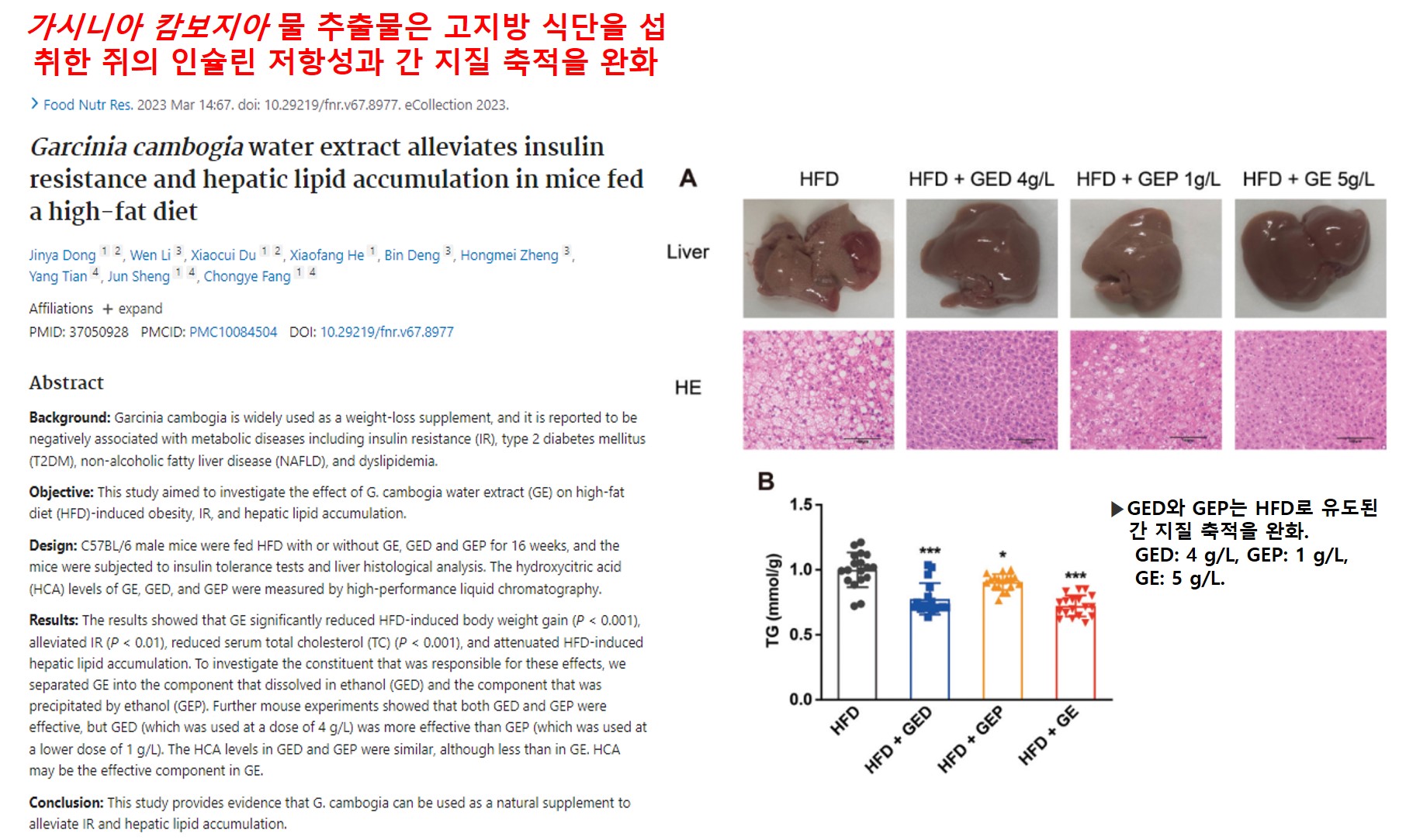 1. 실험방법: 본 연구에서는 C57BL/6 수컷 마우스에게 16주 동안 GE, GED, 또는 GEP를 포함하거나 포함하지 않는 고지방식이(HFD)를 공급한 후, 인슐린 내성 검사와 간 조직학적 분석을 실시. GE, GED, 및 GEP의 하이드록시시트르산(HCA) 농도는 고성능 액체 크로마토그래피(HPLC)를 통해 측정.