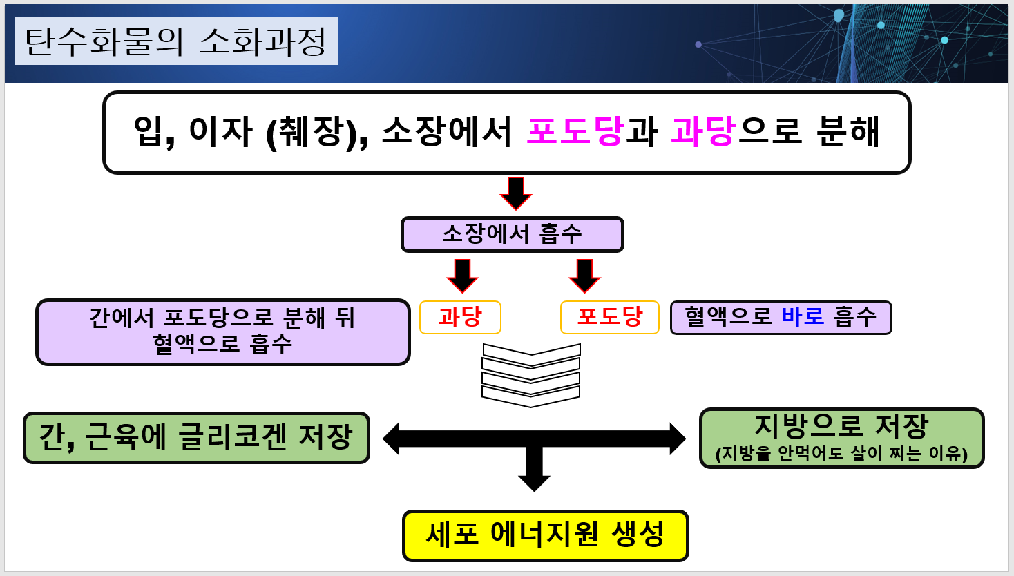 • 음식물 섭취 후 혈액 내에 포도당이 증가하면 췌장은 인슐린을 분비하게 되고, 분비된 인슐린은 세포가 포도당을 흡수하여 에너지원으로 사용하도록 도와주며, 남은 포도당은 간에 저장되도록 해요. 이를 통해 혈당 수치를 적절하게 유지할 수 있게 되는데 혹시나 인슐린이 제대로 작동하지 않으면 당뇨병과 같은 질환이 발생할 수 있어요.