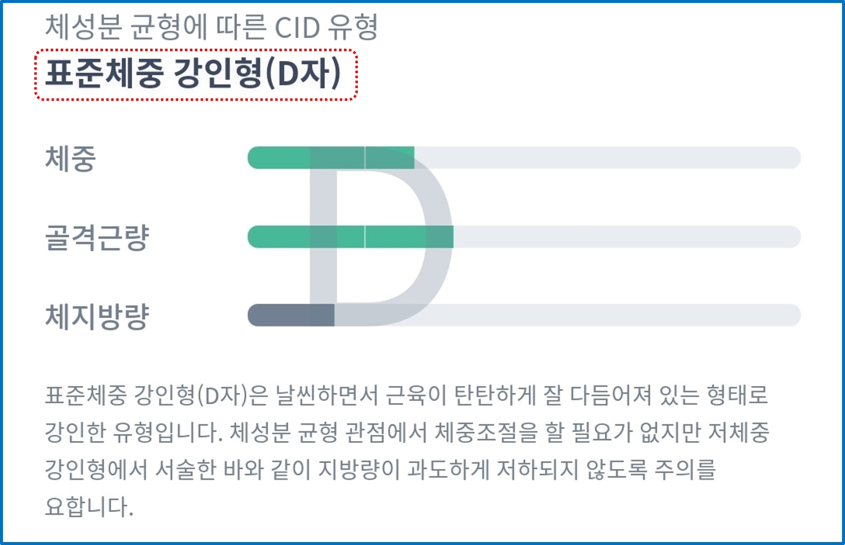 - 특성: 날씬하고 근육이 탄탄하게 발달된 체형으로, 강인한 유형입니다. 체성분 균형이 잘 유지된 상태임.
