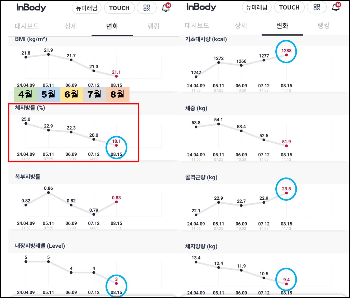 저의 인바디상 4월 기초대사량이 1242kcal (골격근량 22.1kg) 이었으나 8월에 기초대사량이 1288kcal (골격근량 23.5kg)으로 늘었네요. 더 꾸준히 근육량은 늘리고 체지방률은 낮춰야겠어요. 더더 강인한 형으로 쐬기박기.