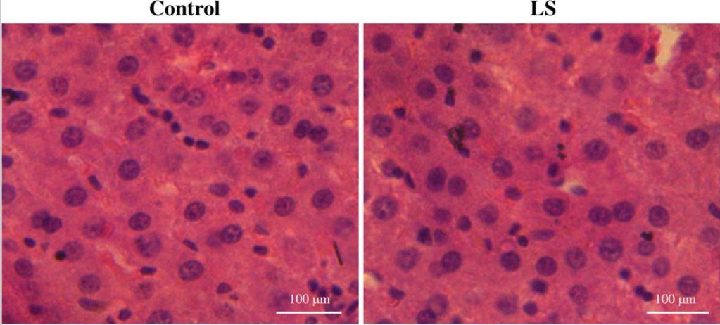 3) 아급성 연구에서 대조군과 LS 치료군의 간 조직 구조에는 변화가 없었으며, 세포사멸, 조직 분해, 풍선화가 관찰되지 않았음.