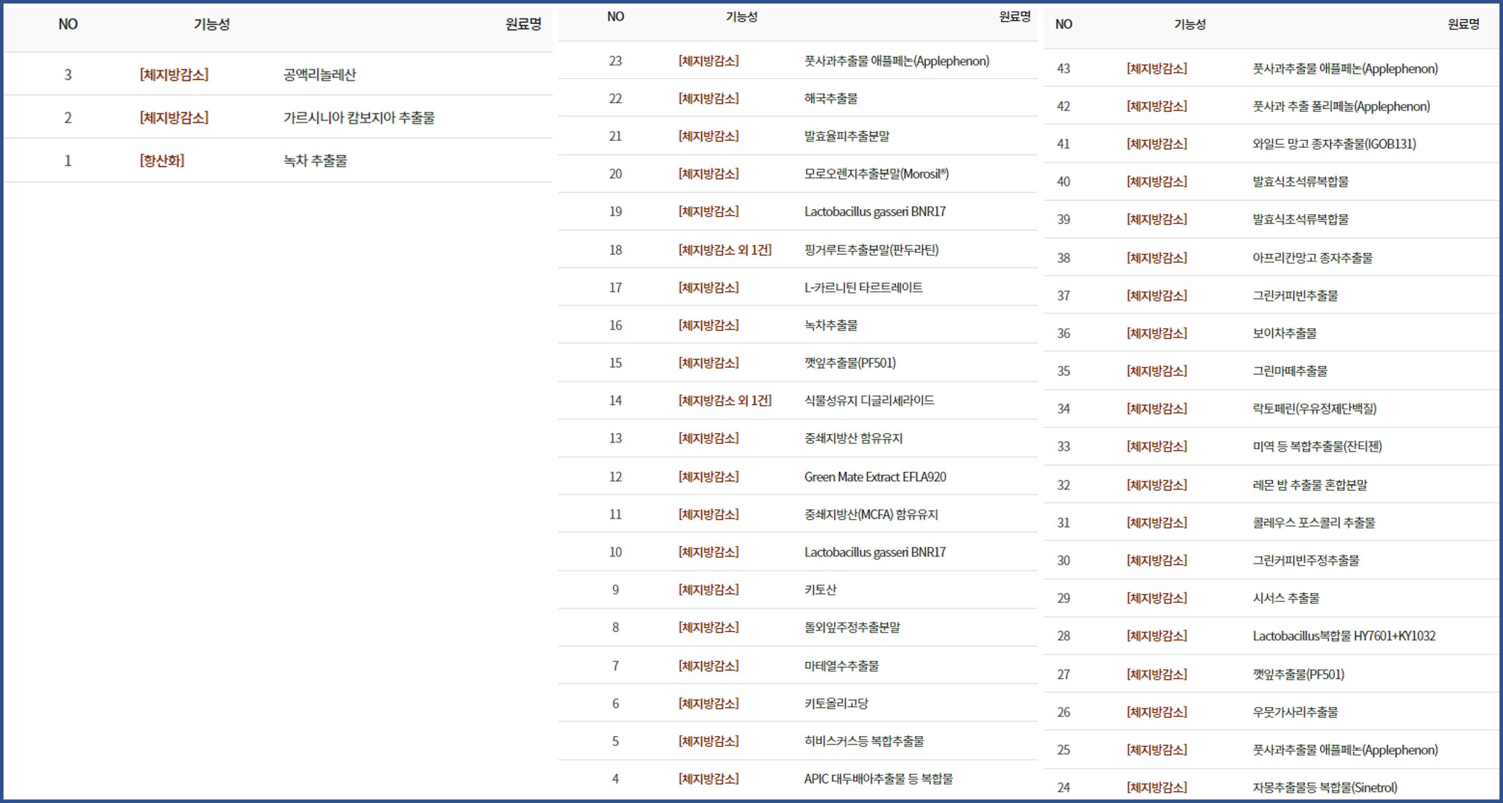 건기식의 원료인정현황에서 기능성 (체지방 감소)로 검색을 해보니 무려 43개가 존재하네요. 요새는 면역쪽이나 여성 갱년기 관련 기능성 성분이 대세를 이루기에 최근 개별 인정된 게 드물다는 생각이 드네요.