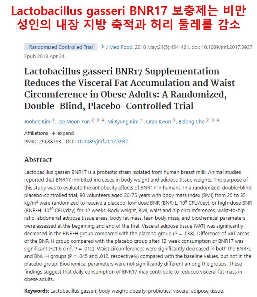 [논문서칭 5] Lactobacillus gasseri BNR17 보충제는 비만 성인의 내장 지방 축적과 허리 둘레를 감소